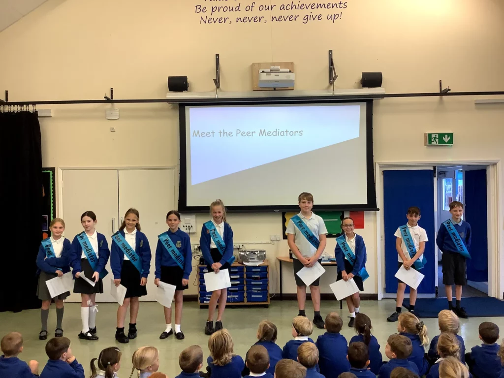 Peer mediation is a process of resolving conflict between students. It is run by pupils, for pupils. The benefits for the peer mediators include: developing their listening, leadership, problem solving and communication skills; learning how to express feelings and needs and a growth in their confidence and self-esteem. The process of peer mediation also empowers the children because they are able to take responsibility for their own actions.